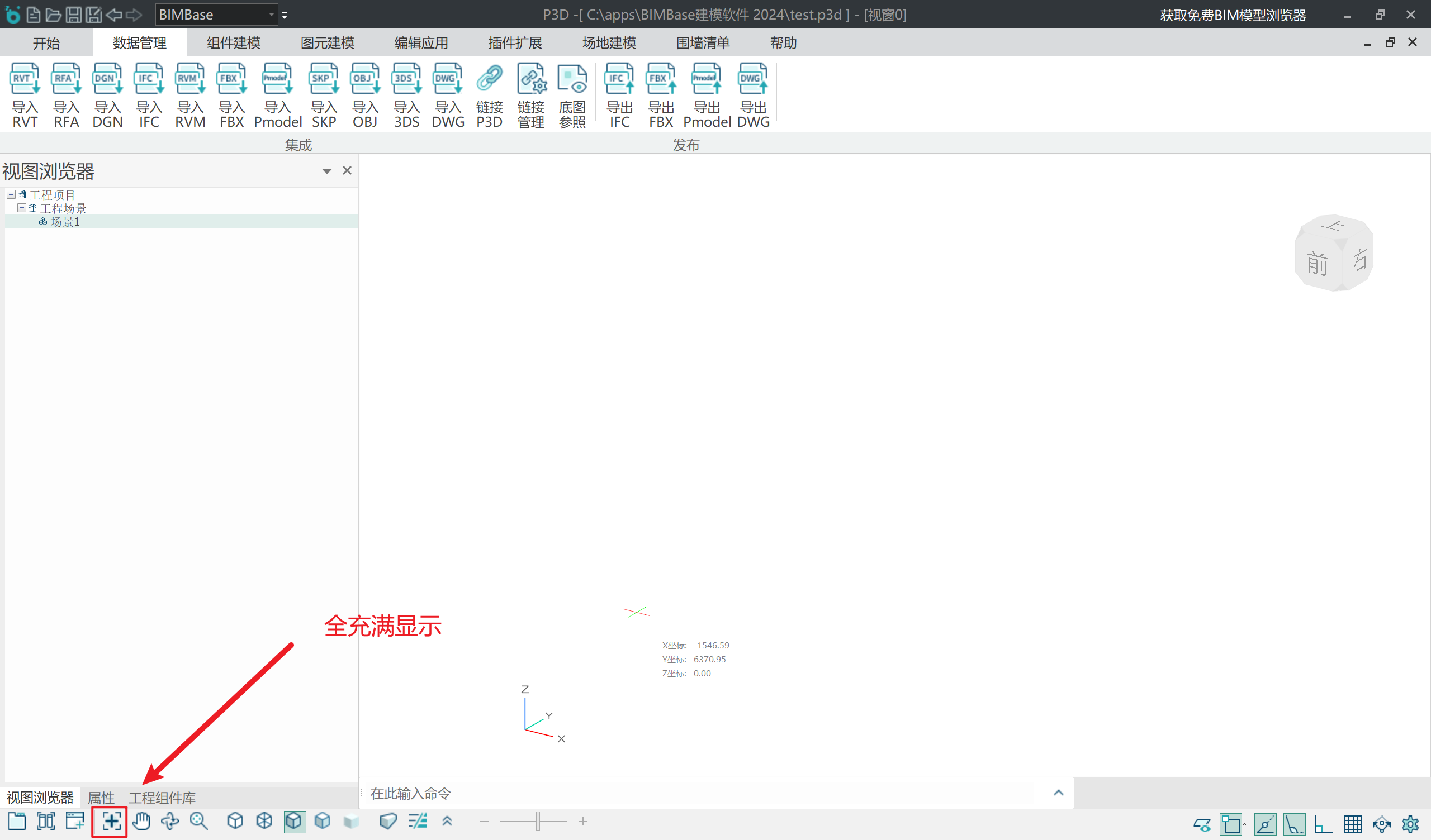 点击状态栏的【全充满显示】按钮,即可根据模型大小调整视图,即可看到模型。