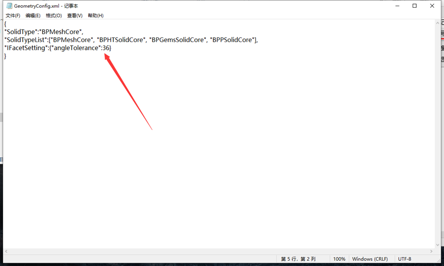 左键单击选中“GeometryConfig.xml”文件,然后右键,选择【打开方式】,然后选择【记事本】(或【写字板】),将AngleTolerance的数值由6修改为36(上限为36,根据电脑配置酌情修改,如修改为36后模型明显卡顿,可以修改为6-36内的任意整数)