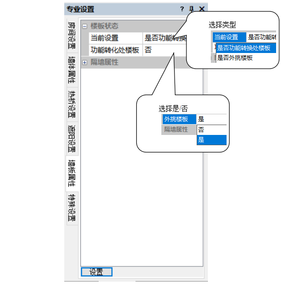 可设置楼板是否功能转换处楼板及是否外挑楼板。