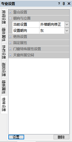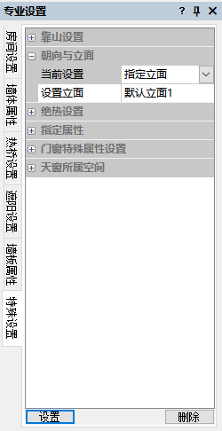 在特殊属性中选择朝向与立面,可对外墙朝向进行修正或者指定外墙为单一立面。