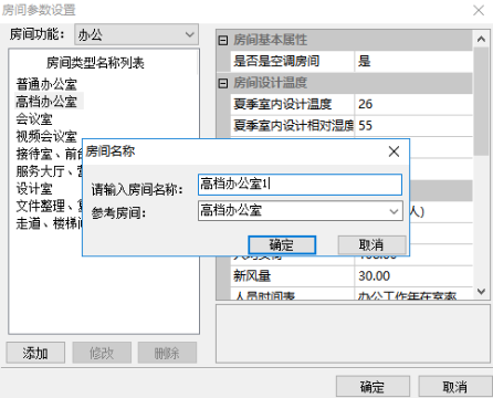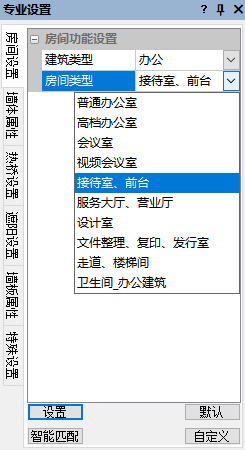 对于公共建筑,软件提供五大类:办公、宾馆、商场、医疗、教育;不同的建筑功能对应不同的房间类型分组,对于办公建筑,房间类型默认类别有普通办公室、高档办公室、会议室、走廊等。选择不同的房间类型,房间参数中的空调采暖、房间设计温度、照明、空气换气指数等参数均有所不同。选择不同标准房间参数也会有所不同。