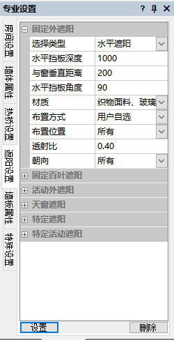 使用“专业设置-墙体属性-遮阳设置”详细步骤: