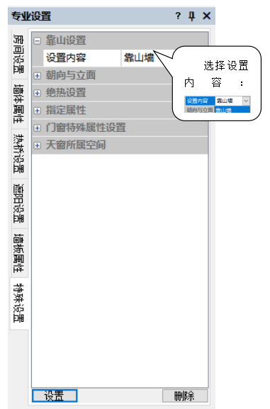 1.选择设置内容:靠山墙/靠山楼板/靠山屋顶。