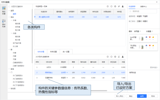 目录 搜索 展开 封面版权与商标说明第一章 安装与运行1.1 软件安装1.2 软件启动1.2.1 启动界面1.2.2 登录与授权1.3 操作界面第二章 模型建立2.1 楼层工具2.2 轴网工具2.3 构件创建2.4 其他通用建模功能第三章 管理3.1 文件管理3.2 .bdls导入与导出3.2.1 导入.bdls3.2.2 导出.bdls3.3 分析模型3.3.1 查看分析模型3.3.2 重置分析模型3.3.3 智能纠正内外墙3.4 模型属性3.4.1 项目信息3.4.2 建筑类型3.4.3 楼层属性3.4.5 阳台中庭3.4.4 指北针3.5 底图参照3.6 帮助第四章 节能设计4.1 标准参数4.2 专业设置4.3 材料编辑4.4 节能计算4.5 结果分析4.6 报告书第五章 能耗模拟5.1 标准参数5.2 材料编辑5.3 暖通空调5.4 负荷计算5.5 冷热源5.6 能耗计算5.7 动力系统5.8 可再生能源5.9 查阅报告第六章 碳排放6.1 建筑碳排放设计分析软件操作流程6.2 碳排放操作界面6.3 标准参数 6.4 建筑专业设计6.5 一键计算6.6 综合运行能耗及可再生能源6.6.1 节能权衡算法6.6.2 节能权衡算法结果查看6.6.3 时间表6.6.4 空调系统6.6.5 负荷配置6.6.6 负荷计算6.6.7 冷热源设置6.6.8 能耗配置6.6.9 系统能耗算法6.6.10 系统能耗算法结果查看6.6.11 照明能耗6.6.12 动力系统计算6.6.13可再生能源计算6.7 BIM建筑碳专业设计6.7.1 建材生产及运输(物化阶段,隐含碳)6.7.2 建造阶段(物化阶段,隐含碳)6.7.3 运行阶段(运维阶段,直接碳&间接碳)6.7.4拆除阶段6.7.5 绿化碳汇(减碳)6.8 碳排放计算6.9 结果分析6.10 减碳措施6.11 生成报告书第七章 绿建施工图7.1 标准选择7.2 专业设计7.3 条文评价7.4 项目提资7.5 报告输出第八章 天然采光8.1 BIM建筑采光模拟分析软件操作流程8.2 采光主要功能8.3 标准选择8.4 专业设计8.5 采光设计8.6 结果分析8.7 生成报告书第九章 构件隔声9.1 评价标准9.2 房间设置9.3 隔声设置9.4 空气声隔声9.5 撞击声隔声9.6 隔声分析9.7 生成报告第十章 室内风10.1 标准选择10.1.1 计算方法10.2 房间设置10.3 评价范围10.4 开启方式10.5 工况设计10.6 计算分析配置10.7 划分网格10.8 计算10.9 结果分析10.10 生成报告10.11 查看报告 暂无相关搜索结果! 4.3 材料编辑 4.3 材料编辑在模型数据文件形成之后系统会给所有的建筑物构件添加默认的节能材料,您可能会有一套现有的方案,也可以在此基础上适当调整节能设计方案,或者使用者可根据已有的“节能设计方案”自行调整节能参数进行节能设计。