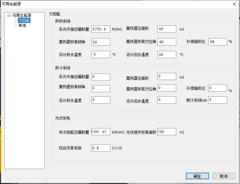 目录 搜索 展开 封面版权与商标说明第一章 安装与运行1.1 软件安装1.2 软件启动1.2.1 启动界面1.2.2 登录与授权1.3 操作界面第二章 模型建立2.1 楼层工具2.2 轴网工具2.3 构件创建2.4 其他通用建模功能第三章 管理3.1 文件管理3.2 .bdls导入与导出3.2.1 导入.bdls3.2.2 导出.bdls3.3 分析模型3.3.1 查看分析模型3.3.2 重置分析模型3.3.3 智能纠正内外墙3.4 模型属性3.4.1 项目信息3.4.2 建筑类型3.4.3 楼层属性3.4.5 阳台中庭3.4.4 指北针3.5 底图参照3.6 帮助第四章 节能设计4.1 标准参数4.2 专业设置4.3 材料编辑4.4 节能计算4.5 结果分析4.6 报告书第五章 能耗模拟5.1 标准参数5.2 材料编辑5.3 暖通空调5.4 负荷计算5.5 冷热源5.6 能耗计算5.7 动力系统5.8 可再生能源5.9 查阅报告第六章 碳排放6.1 建筑碳排放设计分析软件操作流程6.2 碳排放操作界面6.3 标准参数 6.4 建筑专业设计6.5 一键计算6.6 综合运行能耗及可再生能源6.6.1 节能权衡算法6.6.2 节能权衡算法结果查看6.6.3 时间表6.6.4 空调系统6.6.5 负荷配置6.6.6 负荷计算6.6.7 冷热源设置6.6.8 能耗配置6.6.9 系统能耗算法6.6.10 系统能耗算法结果查看6.6.11 照明能耗6.6.12 动力系统计算6.6.13可再生能源计算6.7 BIM建筑碳专业设计6.7.1 建材生产及运输(物化阶段,隐含碳)6.7.2 建造阶段(物化阶段,隐含碳)6.7.3 运行阶段(运维阶段,直接碳&间接碳)6.7.4拆除阶段6.7.5 绿化碳汇(减碳)6.8 碳排放计算6.9 结果分析6.10 减碳措施6.11 生成报告书第七章 绿建施工图7.1 标准选择7.2 专业设计7.3 条文评价7.4 项目提资7.5 报告输出第八章 天然采光8.1 BIM建筑采光模拟分析软件操作流程8.2 采光主要功能8.3 标准选择8.4 专业设计8.5 采光设计8.6 结果分析8.7 生成报告书第九章 构件隔声9.1 评价标准9.2 房间设置9.3 隔声设置9.4 空气声隔声9.5 撞击声隔声9.6 隔声分析9.7 生成报告第十章 室内风10.1 标准选择10.1.1 计算方法10.2 房间设置10.3 评价范围10.4 开启方式10.5 工况设计10.6 计算分析配置10.7 划分网格10.8 计算10.9 结果分析10.10 生成报告10.11 查看报告 暂无相关搜索结果! 6.6.13可再生能源计算 6.6.13可再生能源计算可设置可再生能源系统:太阳能供热和太阳能供冷、太阳能光伏等设置。生活热水在动力能耗里设置。