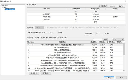 撞击声隔声设计:撞击声隔声设计只能用类比法的方法,且没有噪声修正值。界面上还显示构件的综合面密度,构件隔声量和控制项要求。这里的控制项要求指的是《民用建筑隔声设计规范》GB 50118中的低限要求。