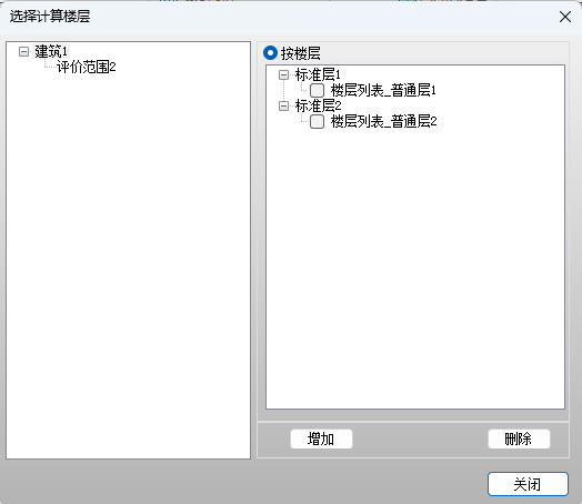 如图,先勾选楼层,点击“增加”即可添加评价范围,同时软件推荐设置默认每一标准层为一个评价范围。评价范围设置完成后,也可进行修改或者删除操作。