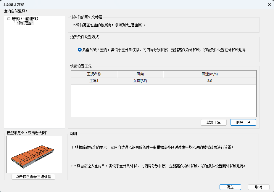 目录 搜索 展开 封面版权与商标说明第一章 安装与运行1.1 软件安装1.2 软件启动1.2.1 启动界面1.2.2 登录与授权1.3 操作界面第二章 模型建立2.1 楼层工具2.2 轴网工具2.3 构件创建2.4 其他通用建模功能第三章 管理3.1 文件管理3.2 .bdls导入与导出3.2.1 导入.bdls3.2.2 导出.bdls3.3 分析模型3.3.1 查看分析模型3.3.2 重置分析模型3.3.3 智能纠正内外墙3.4 模型属性3.4.1 项目信息3.4.2 建筑类型3.4.3 楼层属性3.4.5 阳台中庭3.4.4 指北针3.5 底图参照3.6 帮助第四章 节能设计4.1 标准参数4.2 专业设置4.3 材料编辑4.4 节能计算4.5 结果分析4.6 报告书第五章 能耗模拟5.1 标准参数5.2 材料编辑5.3 暖通空调5.4 负荷计算5.5 冷热源5.6 能耗计算5.7 动力系统5.8 可再生能源5.9 查阅报告第六章 碳排放6.1 建筑碳排放设计分析软件操作流程6.2 碳排放操作界面6.3 标准参数 6.4 建筑专业设计6.5 一键计算6.6 综合运行能耗及可再生能源6.6.1 节能权衡算法6.6.2 节能权衡算法结果查看6.6.3 时间表6.6.4 空调系统6.6.5 负荷配置6.6.6 负荷计算6.6.7 冷热源设置6.6.8 能耗配置6.6.9 系统能耗算法6.6.10 系统能耗算法结果查看6.6.11 照明能耗6.6.12 动力系统计算6.6.13可再生能源计算6.7 BIM建筑碳专业设计6.7.1 建材生产及运输(物化阶段,隐含碳)6.7.2 建造阶段(物化阶段,隐含碳)6.7.3 运行阶段(运维阶段,直接碳&间接碳)6.7.4拆除阶段6.7.5 绿化碳汇(减碳)6.8 碳排放计算6.9 结果分析6.10 减碳措施6.11 生成报告书第七章 绿建施工图7.1 标准选择7.2 专业设计7.3 条文评价7.4 项目提资7.5 报告输出第八章 天然采光8.1 BIM建筑采光模拟分析软件操作流程8.2 采光主要功能8.3 标准选择8.4 专业设计8.5 采光设计8.6 结果分析8.7 生成报告书第九章 构件隔声9.1 评价标准9.2 房间设置9.3 隔声设置9.4 空气声隔声9.5 撞击声隔声9.6 隔声分析9.7 生成报告第十章 室内风10.1 标准选择10.1.1 计算方法10.2 房间设置10.3 评价范围10.4 开启方式10.5 工况设计10.6 计算分析配置10.7 划分网格10.8 计算10.9 结果分析10.10 生成报告10.11 查看报告 暂无相关搜索结果! 10.5 工况设计 开启扇设置完成后,需对各开启扇进行工况设计。工况设计中,可选择风自然流动。快速设置:快速设置是将初始条件设置在计算域边界上。在快速设置里用户可以自定义增加或删除工况,可以指定风速来设置,也可以指定风速和风向。