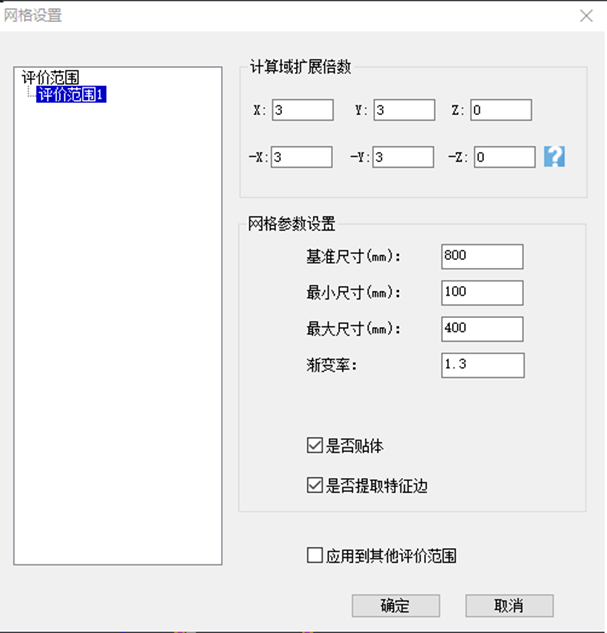 点击网格划分,出现如下图的网格设置,可以对不同的评价范围设置网格尺寸。