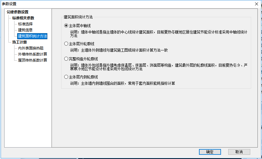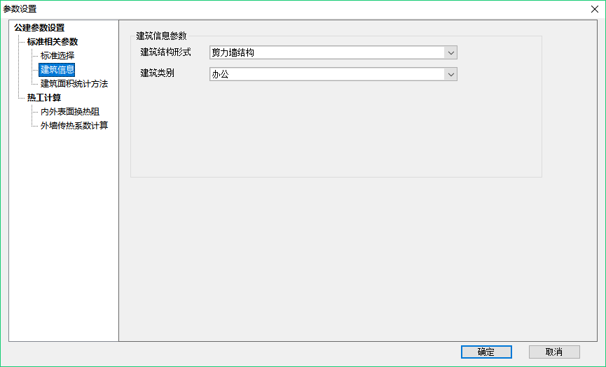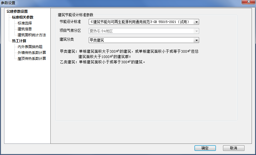 在参数设置中主要是计算所需的参数设置包含评价标准,节能设计标准相关参数、热工计算等。在标准相关参数里,有:标准选择、建筑信息、建筑面积统计、凸窗面积统计等。