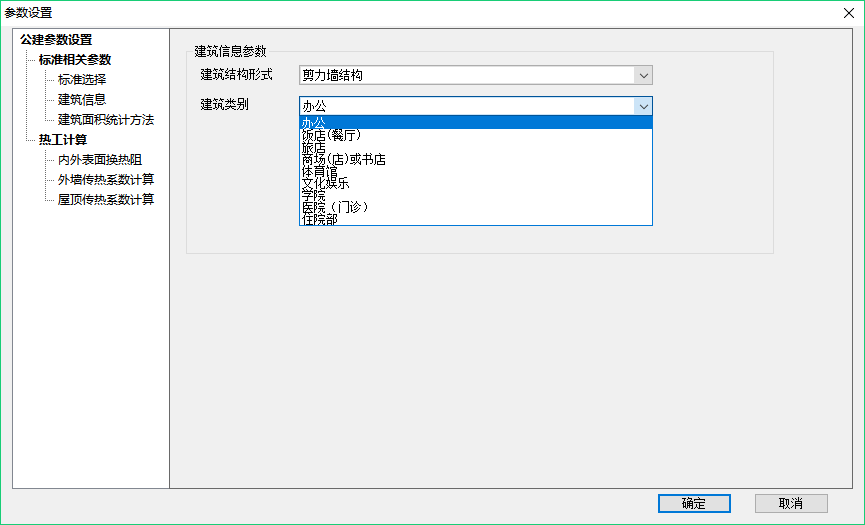 选择建筑功能:建筑类型为所选节能标准中,常用的建筑类型,如办公建筑、饭店、旅馆、旅游旅馆、商场、体育馆、文化娱乐、学院。