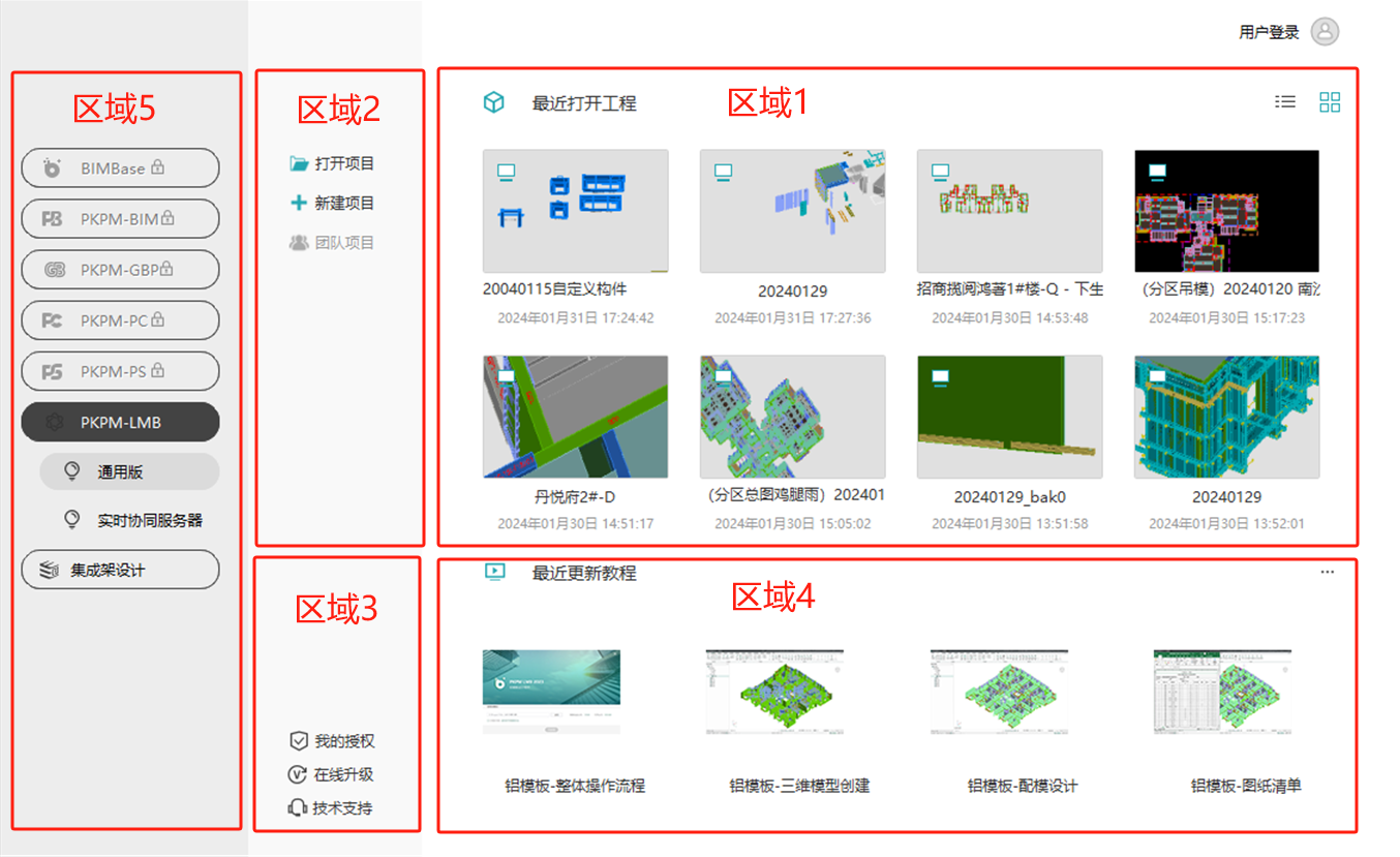 为了优化用户对PKPM软件的使用,在新版本中,程序启动界面提供我的授权点击位置(区域3),同时也提供了教学视频的入口(区域4)以及版本和专业选择位置(区域5)。
