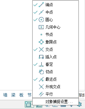 软件提供了13种对象捕捉点,包含了BIM三维建模和二维绘图中常用的捕捉点。可以通过快捷命令F3开启/关闭捕捉设置,同时也可以通过点击状态栏前五个常用捕捉点直接开启,也可以点击对象捕捉按钮旁边的三角按钮,在快捷列表中点击对应的捕捉点开启,如图 1-3-17 对象捕捉,还可直接打开对象捕捉设置对话框,通过复选框勾选对应的捕捉点,如图1-3-15。状态栏的对象捕捉按钮,与对象捕捉设置页面的选项状态是一一联动的。当我们启用了对象捕捉后,鼠标的靶框移动到被捕捉点处时,就能显示勾选的捕捉点类型对应形状的绿色捕捉标记,鼠标光标可自动吸附到捕捉点上,从而选中该点,如图1-3-18。