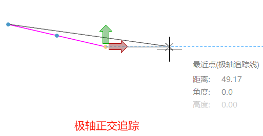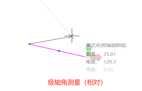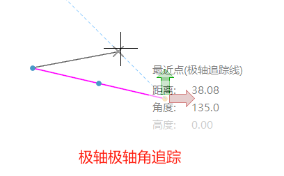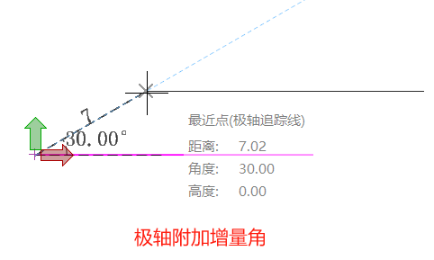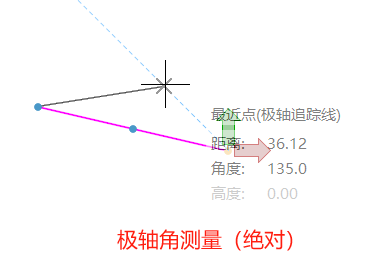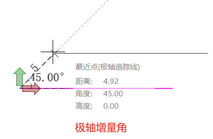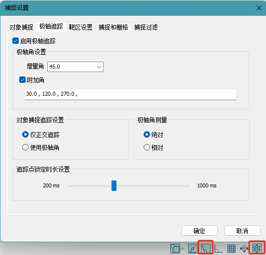 状态栏中开启极轴追踪时,可在鼠标点取处引出极轴追踪线。点击设置按钮进入极轴追踪的设置页面,如图1-3-。状态栏的极轴追踪按钮与设置页面的“启用极轴追踪”选项的勾选状态是联动的。在页面中,可设置极轴增量角和附加角。设置极轴增量角后,会以当前用户坐标系(UCS)的X轴正方向为基线,每隔一个增量角显示追踪线。设置附加角后,会以当前用户坐标系(UCS)的X轴正方向为基线,在该附加角的方向产生追踪线,这个附加角为绝对角度,如图 1-3-4。