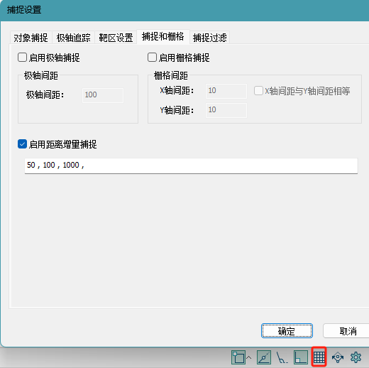 状态栏开启栅格捕捉时,可控制鼠标箭头按固定步长移动,步长为X、Y两个方向。点击设置按钮,可打开捕捉与栅格的页面,如图1-3-。状态栏的栅格捕捉按钮与页面中的启用栅格捕捉选项联动。勾选启用栅格捕捉时,可分别设置X、Y方向的间距,间距必须为正实数,也可通过复选框勾选“X轴间距与Y轴间距相等”。例如,设置了X和Y轴的间距均为1000,则绘制时,鼠标拾取点就会按两个方向为1000的倍数进行移动,如图1-3-27。