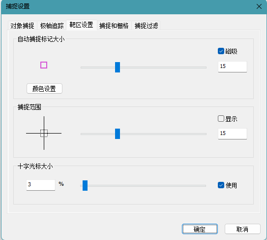 在捕捉设置对话框中,切换到靶区设置页面,可设置捕捉标记、靶框和十字光标的大小。通过拖动调节按钮,向右为增大,向左为减小,可将对应标记调整为合适的大小。勾选上磁吸,可使捕捉点进入靶框范围时自动将鼠标吸附到捕捉点上,如图1-3-30。