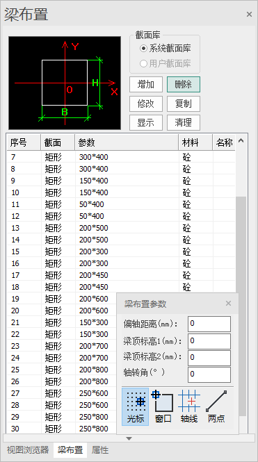 (1)点击“梁布置”按钮后,弹出梁布置对话框;