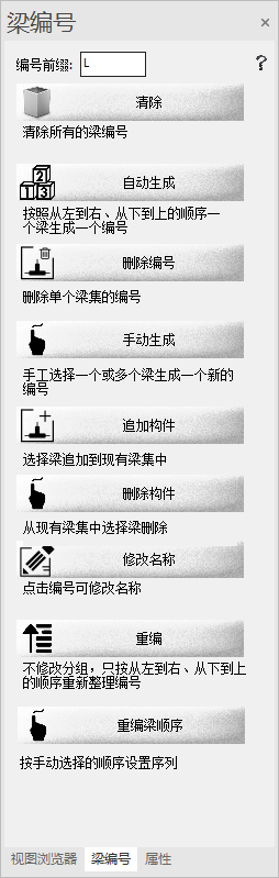 梁编号可以实现梁的自动生成编号功能,它是以从左到右、从下往上的顺序进行编号,如果选择自动生成/拆分可参考构件,则在自动生成的时候,遇见墙、梁、板和柱,会自动拆分梁集,生成梁编号。