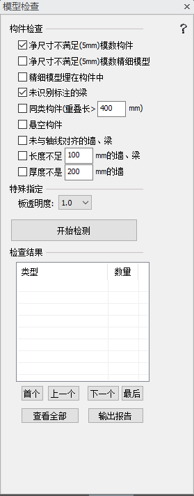 模型检查是检查构件重叠、悬空、未与轴线对齐的梁、未识别标注的梁、长度不足多少毫米的梁和净尺寸不满模数的构件等。
