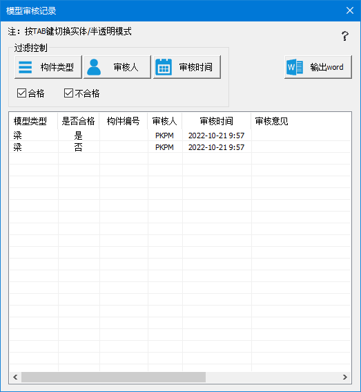 可以查看已审核的记录,并且根据构件类型、审核人、审核时间、是否合格等过滤条件快速定位到用户想查看到的内容。点击列表中某一条审核记录,可以直接在视图中定位到某一构件。