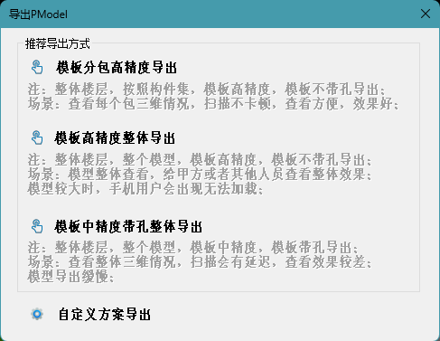 在弹出的对话框中选择所需要导出的模型方案,点击一键淡出;也可以选择自定义方案导出,进入设置界面设置好,点击确定导出。