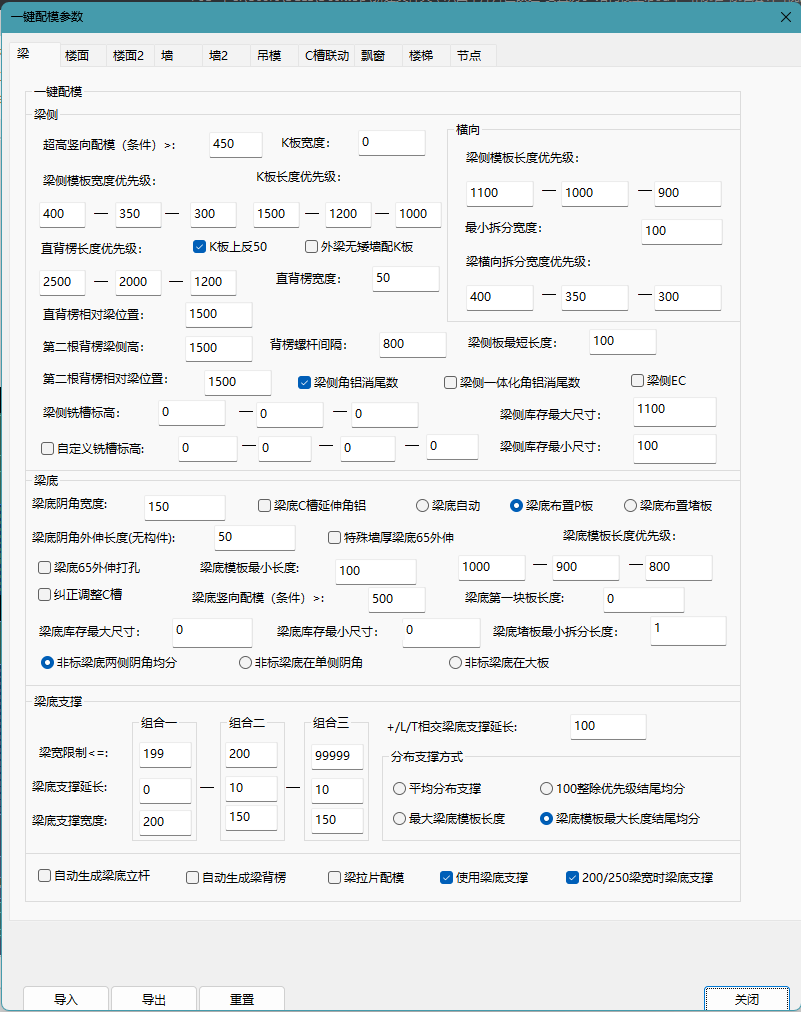墙:包括自动生成对拉螺杆、自动生成背楞、自动生成斜撑、拉片配模、尺寸参数、k板、背楞、方通、接高板、拆分墙板等设置。