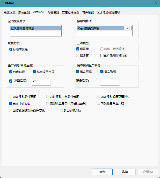 目录 搜索 展开 第1章 系统概述1.1 系统要求1.2 电脑配置1.3 软件界面1.3.1 程序启动界面1.3.2 用户操作界面1.3.3 捕捉工具及动态UCS第2章 图纸深化的要求2.1 底图标准样式2.1.1 楼板2.1.2 梁2.1.3 墙2.1.4 配件2.2 墙梁板的深化第3章 实际配模流程示例3.1 建立结构模型基本步骤3.3 出图、清单步骤3.3.1 图纸3.3.2 清单3.2 配模的方法3.2.1 板配模3.2.2 梁配模3.2.3 墙配模3.2.4 吊模布置3.2.5 飘窗飘台节点配模第4章 结构模型4.1 标准层管理4.1.1 新建标准层4.1.2 创建变截面层4.1.3 修改层高4.1.4 修改层名4.1.5 删除标准层4.2 底图4.2.1 底图DWG4.2.2 平行检查4.2.3 闭合检查4.2.4 线条重叠4.3 识图4.3.1 识别构件4.3.2 隐藏底图4.4 轴网4.4.1 正交轴网4.4.2 生成轴网尺寸4.4.3 显示轴网4.4.4 隐藏轴网4.5 构件布置4.5.1 墙布置4.5.2 梁布置4.5.3 板布置4.5.4 节点造型4.5.5 异形对象4.5.6 工字钢4.5.7 预制构件4.6 构件调整4.6.1 移动4.6.2 复制4.6.3 旋转4.6.4 墙梁延伸4.6.5 删除4.6.6 打断(墙、梁、板)4.6.7 反梁转墙4.6.8 模型互相转换4.6.9 组合/扣减构件4.6.10 对齐4.6.11 改变截面4.6.12 设置基点4.6.13 层间复制4.6.14 选择层复4.7 楼梯4.7.1 楼梯布置4.7.2 左右交换4.7.3 识别梯段4.8 精细造型4.8.1 企口4.8.2 贴片4.8.3 滴水线4.8.4 固定片4.8.5 泵送孔4.8.6 切角修正4.9 模型检查4.9.1 模型修正4.9.2 端部修正4.9.3 文件合并4.9.4 节点编号4.9.5 墙编号4.9.6 梁编号4.9.7 板编号4.9.8 吊模编号4.9.9 楼梯编号4.9.10 模型检查4.9.11 编号检查4.9.12 选择集4.10 模型审核4.10.1 质量审核4.10.2 记录查看4.10.3 结构模型锁定4.10.4 结构模型解锁4.11 模型交互4.11.1 模型导出4.11.2 导出PMODEL(图模大师)4.12 热点吸附第5章 自动配模5.1 参数设置5.1.1 规则设置5.1.2 工程参数5.1.3 显示控制5.1.4 快捷命令5.1.5 工作面5.1.6 配模辅助线5.2 自动配模5.2.1 板5.2.2 梁5.2.3 墙5.2.4 吊模5.2.5 飘窗飘台5.2.6 节点5.2.7 楼梯5.2.8 立杆5.2.9 斜撑5.2.10 对拉螺杆5.2.11 铝垫片5.2.12 一点布置第6章 手动配模6.1 手动配模6.1.1 内转角C槽6.1.2 普通C槽6.1.3 内墙柱C槽6.1.4 顶板6.1.5 中间龙骨6.1.6 边龙骨6.1.7 梁侧6.1.8 梁底6.1.9 墙侧6.1.10 K板6.1.11 角铝6.1.12 底角铝6.1.13 7字角铝6.1.14 支撑6.1.15 封板6.1.16 角钢6.1.17 背楞6.1.18 立杆6.1.19 斜撑6.1.20 面板孔6.1.21 边框孔6.1.22 楼梯配模6.1.23 转角C槽6.1.24 转角板6.1.25 异形板6.1.26 转角支撑6.1.27 截面倒角板6.1.28 L型倒角板6.1.29 内弧板6.1.30 外弧板6.1.31 弧形板识别6.2 模板调整6.2.1 移动6.2.2 旋转6.2.3 删除6.2.4 延伸6.2.5 复制6.2.6 合并6.2.7 拆分6.2.8 吸附6.2.9 镜像6.2.10 格式刷6.2.11 墙板切割6.2.12 模板翻转6.2.13 两翼交换6.3 模板查看6.3.1 快速过滤6.3.2 选择过滤6.3.3 选择集6.4 模板检查6.4.1 碰漏检查6.4.2 模板漏布检查6.4.3 背楞漏布检查6.4.4 背楞规格检查6.4.5 框外查询6.4.6 模数检查6.4.7 拉力丝碰撞检查6.4.8 配件检查6.4.9 孔位检查6.4.10 检查模式6.4.11 模板搜索6.5 模板审核6.5.1 质量审核6.5.2 记录查看6.5.3 模板合并6.6 拉片配模6.6.1 墙板/墙阴角半自动配模6.6.2 附加方通6.6.3 方通扣6.6.4 方通的布置6.6.5 拉片槽检查第7章 图纸清单7.1 参数设置7.1.1 工程参数7.1.2 显示控制7.1.3 识别签名7.2 构件编号7.2.1 划分区域7.2.2 编号检查7.2.3 节点编号7.2.4 墙编号7.2.5 梁编号7.2.6 板编号7.2.7 吊模编号7.2.8 楼梯编号7.3 模板编号7.3.1 关联指定7.3.2 自动编号7.3.3 手动编号7.3.4 模板/模型的锁定7.3.5 模板/模型的解锁7.3.6 未关联模板7.4 配色统计7.4.1 配色方案7.4.2 模板统计7.5 图纸管理7.5.1 图纸参数7.5.2 定义图框7.5.3 放线图7.6 安装编码图7.6.1 楼梯安装图7.6.2 构件集安装图7.6.3 添加附加图7.6.4 编码图7.7 生产图7.7.1 生产图7.7.2 楼梯生产图7.7.3 选择出图7.7.4 配件出图7.7.5 楼梯配件出图7.7.6 生产图分类7.8 爆炸图7.8.1 爆炸图7.8.2 特殊图7.8.3 合并图7.8.4 导出DWG7.9 产品清单7.9.1 清单参数7.9.2 下料单7.9.3 打包单7.9.4 销售清单7.9.5 清单配置7.9.6 自定义清单7.9.7 清单预览7.10 工程变更7.12 变更模式7.11 选项设置7.11.1 参数设置7.11.2 变更配色7.13 图纸管理7.14 产品清单第8章 可视安装8.1 安装图定位8.1.1 Pmodel导出上传8.1.2 模板标签及扫码定位8.2 生产图定位第9章 标准库管理9.1 构件库9.3 块数据库9.3.1 块导入9.3.2 块数据管理9.4 模板体系9.4.1 简易配置(不带配件的模板)9.4.2 复杂配置9.5 命名识别9.7 简略编号9.2 标准库的导出9.2.1 标准库的导入 9.6 专有体系9.6.1 切换体系9.6.2 编辑体系9.6.3 合并体系第10章 协同设计10.1 协同登录10.2 协同操作10.3 显示设置10.4 聊天设置第11章 自定义模板11.1 新建自定义模板11.2 自定义模板布置11.3 自定义模板管理第12章 绘图工具12.1 修改12.1.1 颜色12.1.2 旋转12.1.3 复制12.1.4 移动12.1.5 镜像12.1.6 删除12.1.7 面对齐12.2 注释12.2.1 衬图DWG12.2.2 标注样式12.2.3 线性标注12.2.4 单行文字12.2.5 文字样式12.3 工具12.3.1 轴对齐测量12.3.2 测线角度12.3.3 测量标高12.3.4 窗洞尺寸12.3.5 查询坐标12.3.6 剖切显示12.3.7 重置剖切12.3.8 区域剖切12.3.9 退出切断第13章 基础建模13.1 图形13.2 平面13.3 实体13.4 造型及其他第14章 帮助14.1 颜色配置14.1.1 构件颜色14.2 面板设置14.2.1 快捷命令14.3 帮助14.3.1 帮助手册14.3.2 更新日志14.3.3 常见问题14.3.4 指导视频14.3.5 修复工具14.3.6 加载插件14.4 说明14.4.1 关于第15章 附录15.1 项目文件兼容处理15.2 常用快捷命名 暂无相关搜索结果! 5.1.2 工程参数 <br /> 图5-1-2 工程参数 (1)总体设置:公司名称、工程名称、客户名称
