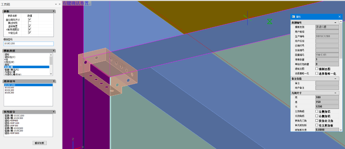 (6)模板类型列表:模板类型中有墙板、K板、C槽、拉片板、支撑等可选择,当点击一种模板类型之后,下面的模板“推荐型号”也会随即更新变化,用户可直接在“推荐型号”中选择所需的模板型号,当推荐列表里面的模板型号命名和现使用的配置命名不一致时,上面那个“模板型号”的框框会显示红色,用户也可以直接在“模板型号”的框框里输入所需的模板尺寸(注意:模板类型列表中的墙板包含了墙板、梁板、顶板等各类大板,用户可直接在模板型号框框那里输入对应模板的名称,出来的就是对应的模板)。