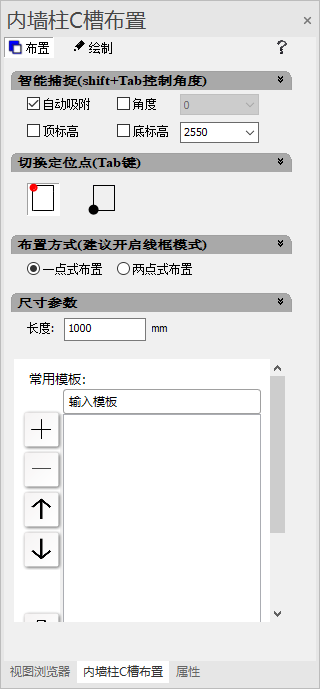 内墙柱C槽的设计思路是:当定位点在顶上的点时,默认用户是从上往下布置,在智能吸附的时候会自动布置到内转角C槽下面。当定位点切换到底端时,默认用户是从下往上布置,这时智能吸附的时候会从捕捉点往上提升8mm。
