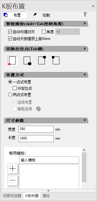 在布置时,智能捕捉提供了“自动与墙对齐”“角度”“自动升到墙顶上部50mm”功能。一般K板是和墙对齐,并且超过墙顶标高50mm,所以选中这些只能布置可直接达到用户布置的一般要求。