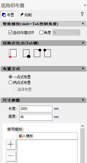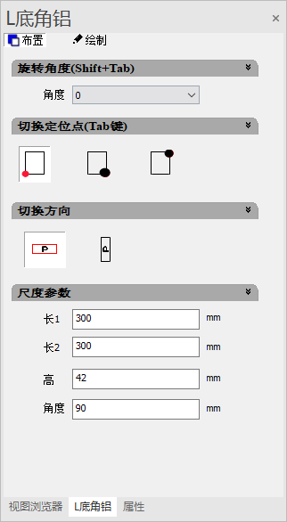 (1)点击“L底角铝”,Shift+Tab键切换好模板旋转的角度和定位点,选择尺寸参数(可以非90°);