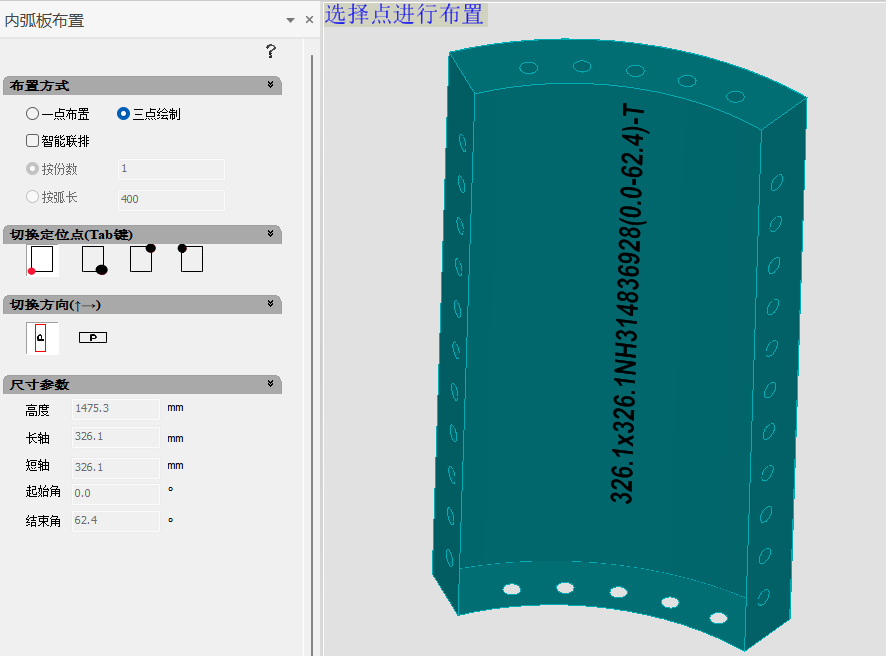 三点绘制:选择弧形边三点,第四点选择长度方向定位点,布置完成。