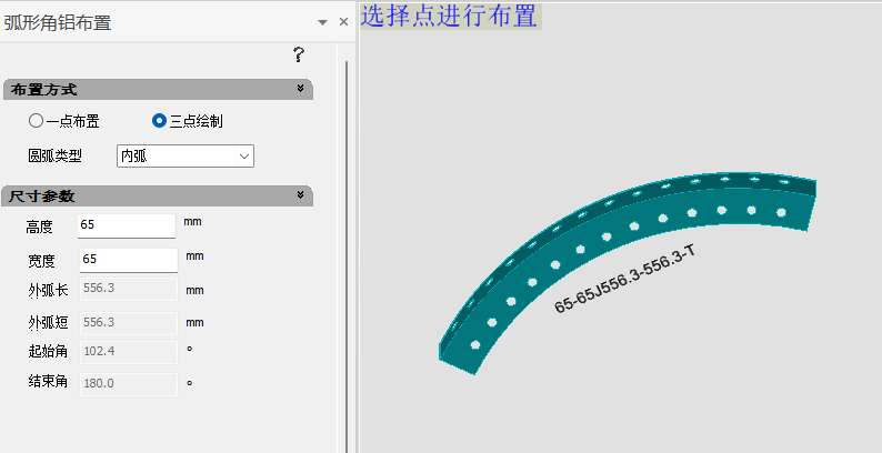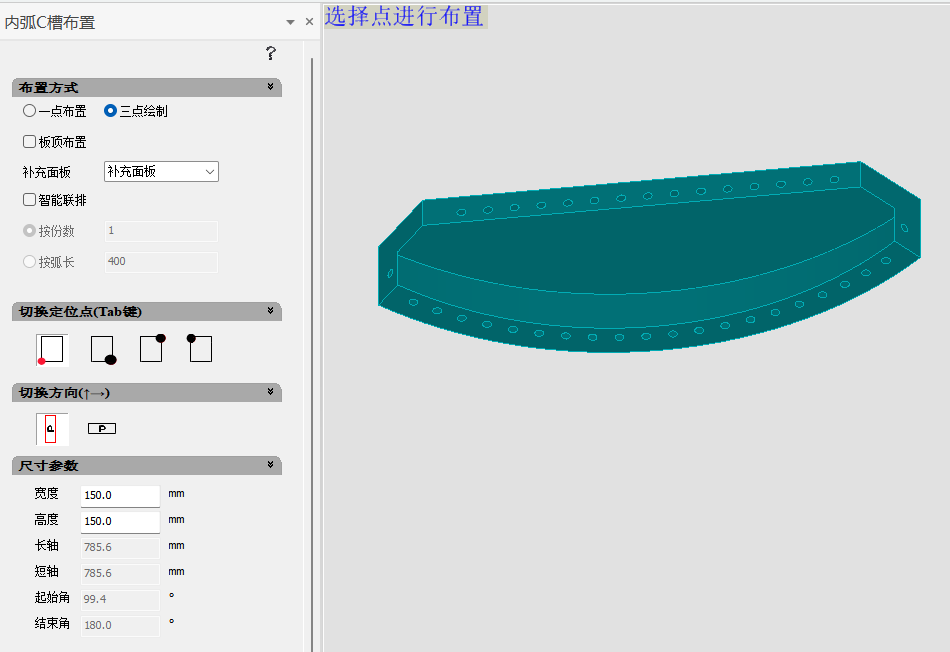三点绘制:设置面板类型及C槽尺寸,选择弧形边三点,布置完成。