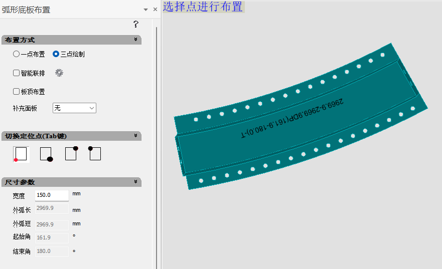 三点绘制:设置面板类型及底板宽度,选择弧形边三点布置完成。