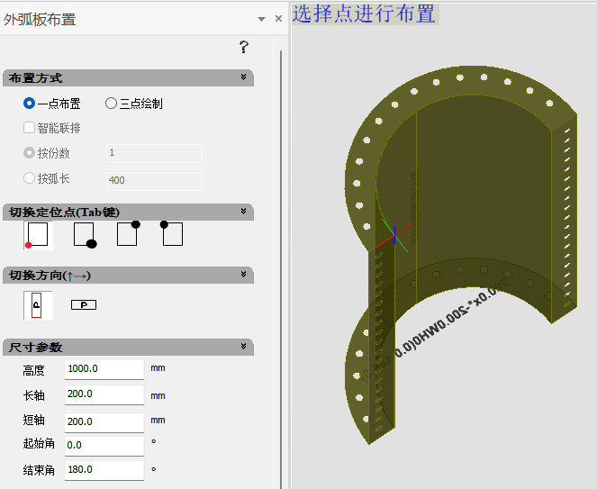 一点布置:选择圆弧类型,设置尺寸参数,选择布置点。