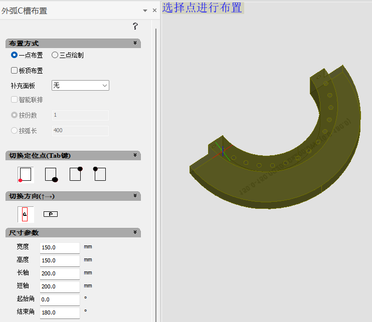 三点绘制:设置面板类型及C槽尺寸,选择弧形边三点,布置完成。