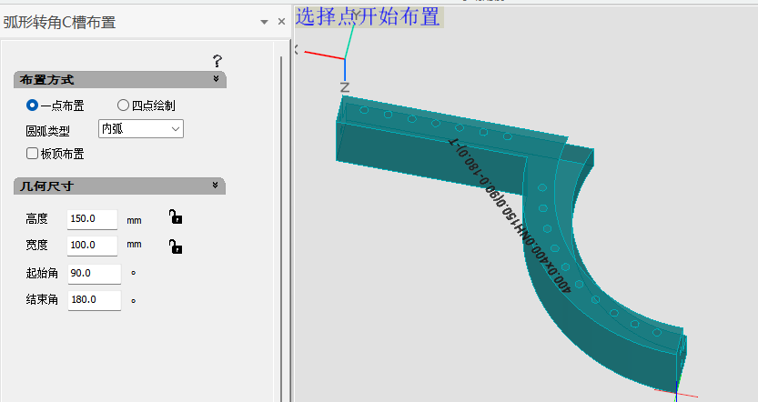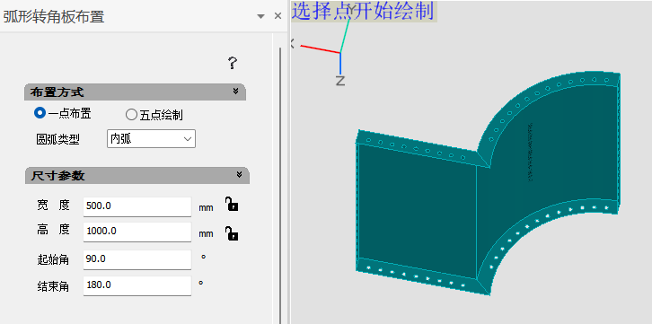 一点布置:选择圆弧类型及是否顶板布置,设置尺寸参数,选择布置点。