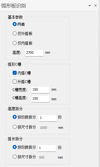弧形板识别可识别弧形结构,针对弧形结构进行一键排布,在基本设置中设置内弧、外弧以及弧形板的高度,在弧形C槽中设置C槽参数,并对弧形板的长度和高度进行划分,软件就能一键生成弧形板上的模板。