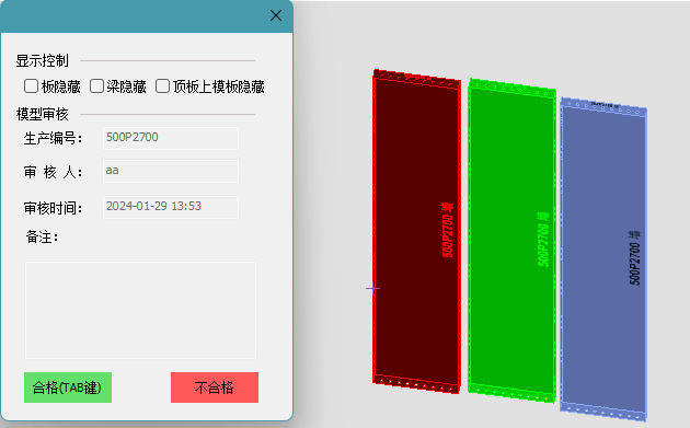 (3)选择构件,可在“备注”中输入对此构件的审核意见,点击“合格”或Tab快捷键审核合格构件,点击“不合格”审核不合格的构件,审核后的构件会变成相应的颜色方便识别。