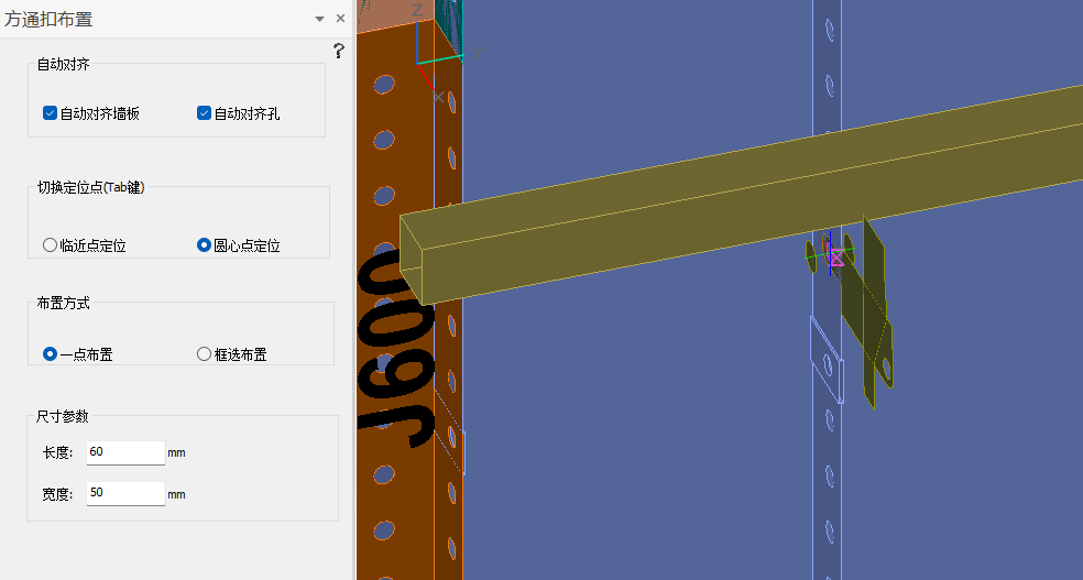 (3)在拉片槽位置的孔位置进行点击即可布置方通扣;