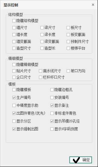 可在此对话框中勾选是否隐藏结构模型,是否显示墙梁板和墙梁板变截面的结构尺寸,是否隐藏精细模型,是否隐藏模板,是否显示生产编号和安装编号等等。此显示控制是全局控制。