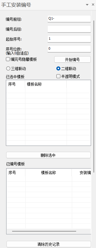 二维联动修改前需点击“开启联动修改”按键,选择“二维联动”其他操作同三维联动修改,选择二维图纸模板框线即可选中模板,选中后点击“开始编号”完成手动编号。