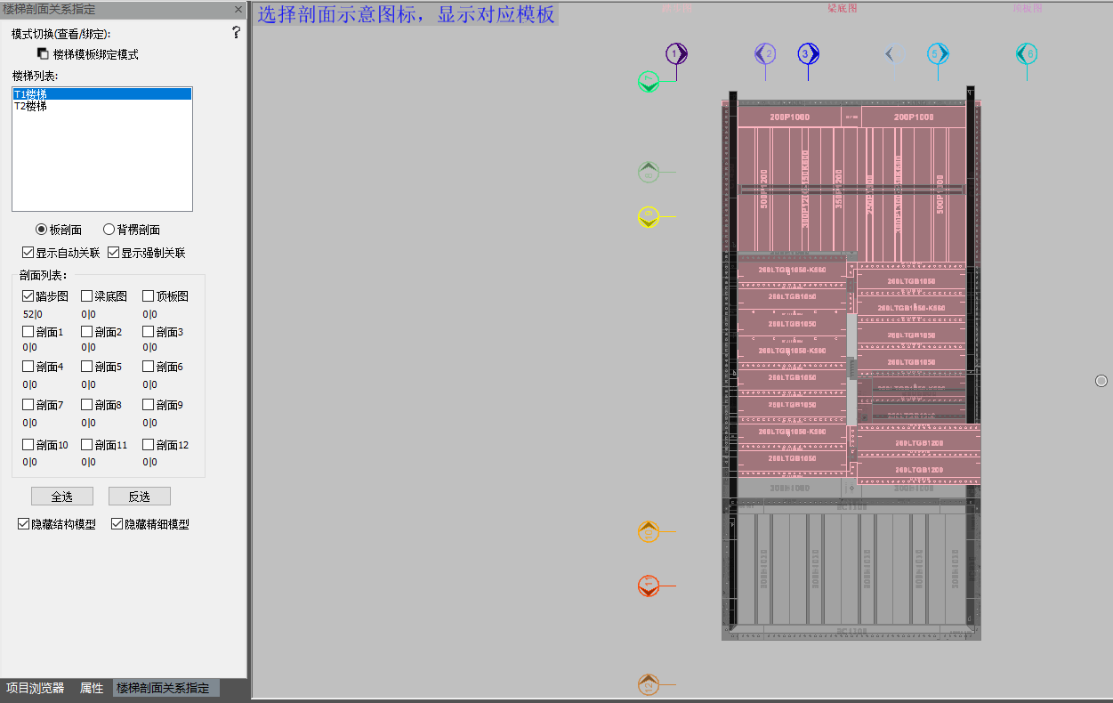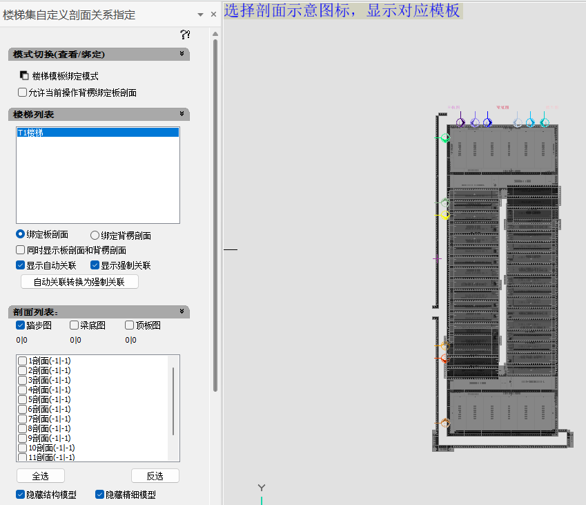 开启绑定模式,选择模板,点击空白处,再选择绘图区对应的剖面号,右键确认完成模板剖面指定。