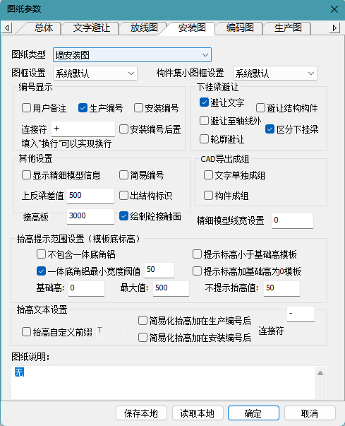 (4)编码图、安装图、生产图:都包括了图纸类型(如:墙、梁、板、节点、楼梯),图纸说明等设置(如图7-5-1)。