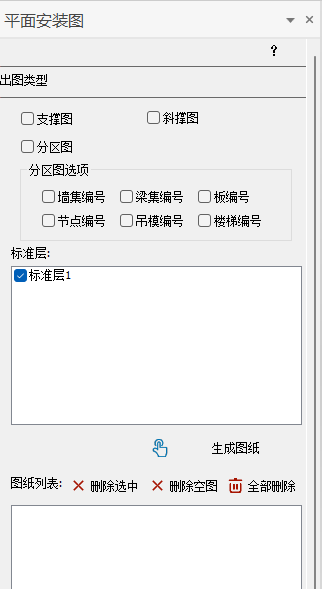 在左侧面板中,勾选上需要出图的支撑图、斜撑图、分区图,选择标准层(变层),点击“生成图纸”可生成对应需要的图纸。