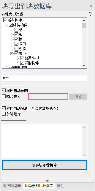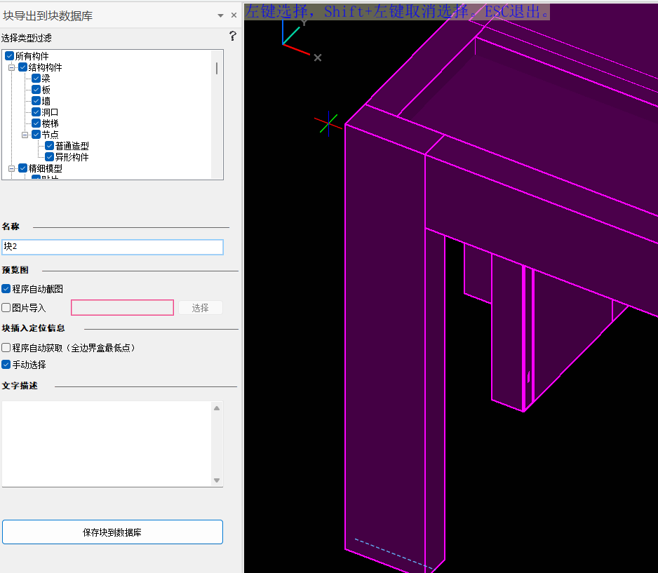 (5)点击“保存块到数据库”。(假如块插入基点的方式是“手动选择”,则需在右侧视窗选择好基点后,点击第一点确认原点,再次点击第二点确认X轴方向,再此按Tab键确认导出)