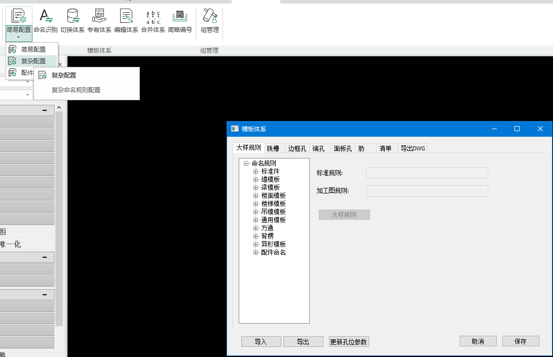 复杂配置中命名规则不要进行修改,主要修改铣槽,边框孔,面板孔,肋(可不进行修改),修改之后除标准件外,其他默认规则。