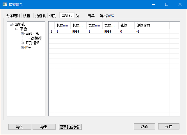 针对普通C槽,平板等,更改孔位规则,例如: 50*3,150*N0,50*N1(4|5|6),30~79。此处第一个50*3,代表起孔50,间隔50,三个孔;150*N0,代表间隔150向后冲孔, 50*N1(4|5|6),代表50间隔冲孔,有可能有4,5或6个孔,最后一个30~79表示剩余孔间隔大于等于30,小于等于79.