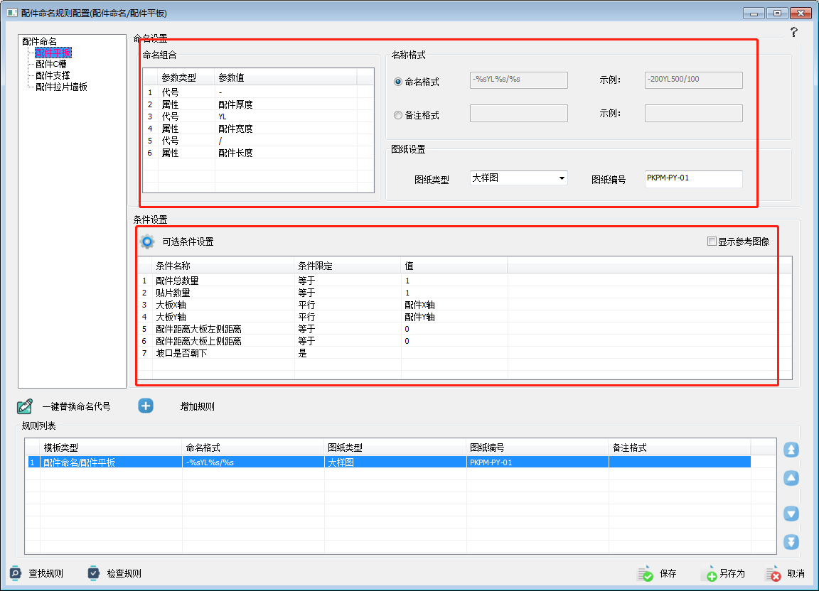 配件规则是在简易配置的基础上,配置面板和方法与简易配置一样,检查规则的时候需要在模板后面布置对应配件。