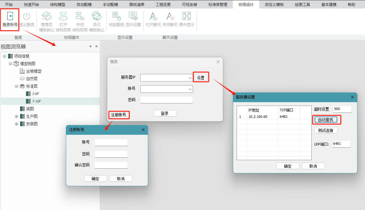 2. 协同账号的注册:新建或打开任意一个工程进入协同设计模块,点击登入账号,先在“设置”中自动查找到协同的IP地址并填写到服务器IP中(当查找到多个IP地址时,任意选择其中一个,只需保证同一个组的组员用的都是同一个IP即可),点击注册账号,注册个人协同账号并进行登入。